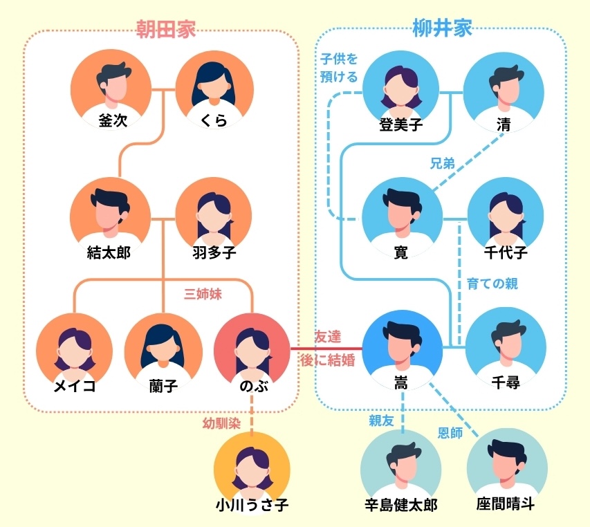 - 朝田くら(浅田美代子):祖母。おっとりした性格で、若い頃は女優に憧れていた過去も。