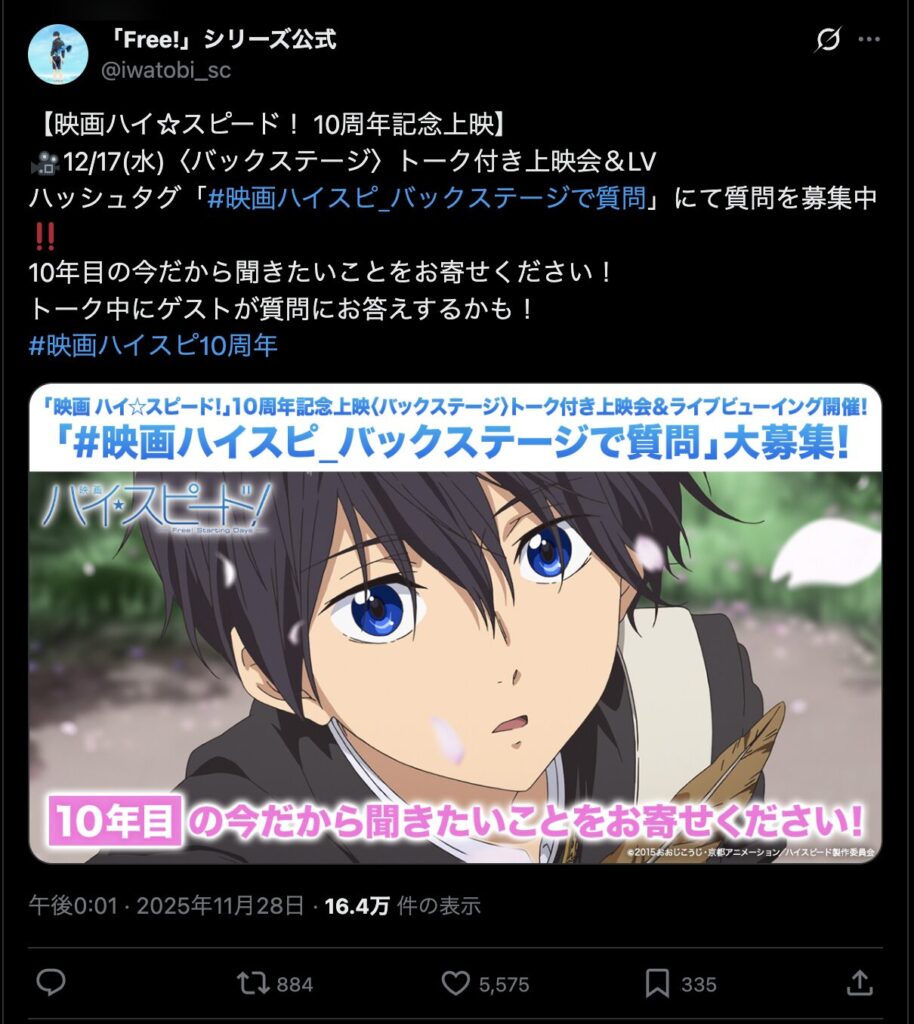 映画『ハイ☆スピード!-Free! Starting Days-』が10周年を迎えることを記念して、トーク付き上映会&LVイベントが開催されます!