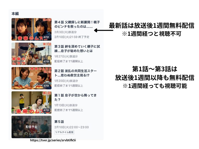 そのため、最新話は放送後1週間経つと視聴できなくなります。