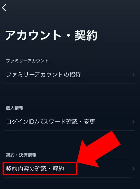 3:[アカウント・契約]を画面最下部までスクロールし[契約・決済情報]にある [ 契約内容の確認・解約 ] を選択