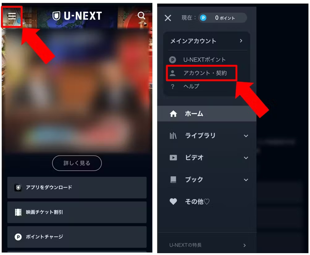 2:画面左上の [ Ξ ] を選択するとメニューが表示されます。表示されたメニューから [ アカウント・契約 ] を選択